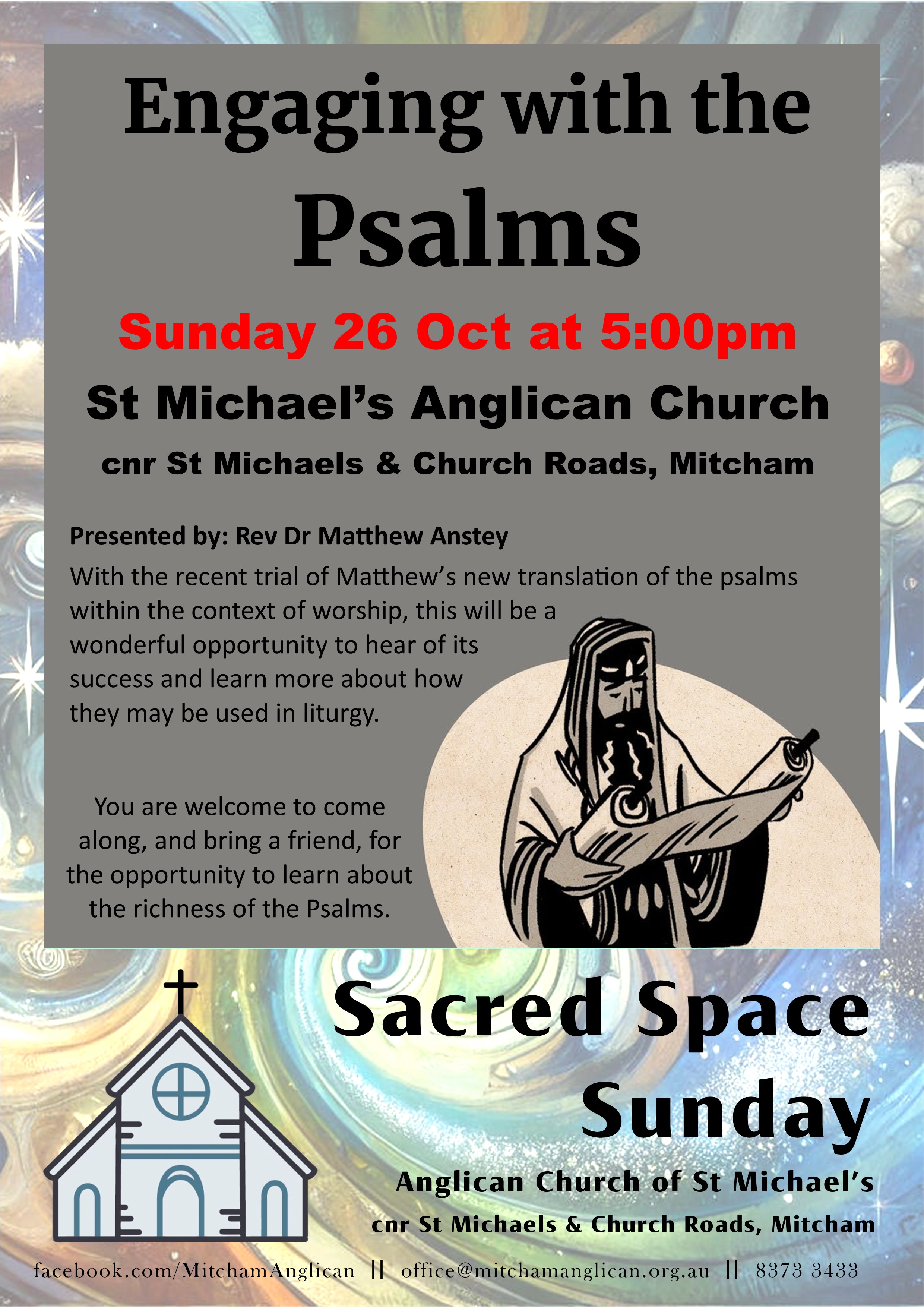You are invited to a Sacred Space session at St Michael’s Mitcham on “Engaging with the Psalms” - Sunday 26th October, 5:00pm. This session will be presented by The Rev’d Dr Matthew Anstey, how is currently translating the Psalms and recent did a trial of the new translation. Come along an learn more about the use the psalms and who we can engage with them. Join us 5:00pm on Sunday 26 October.