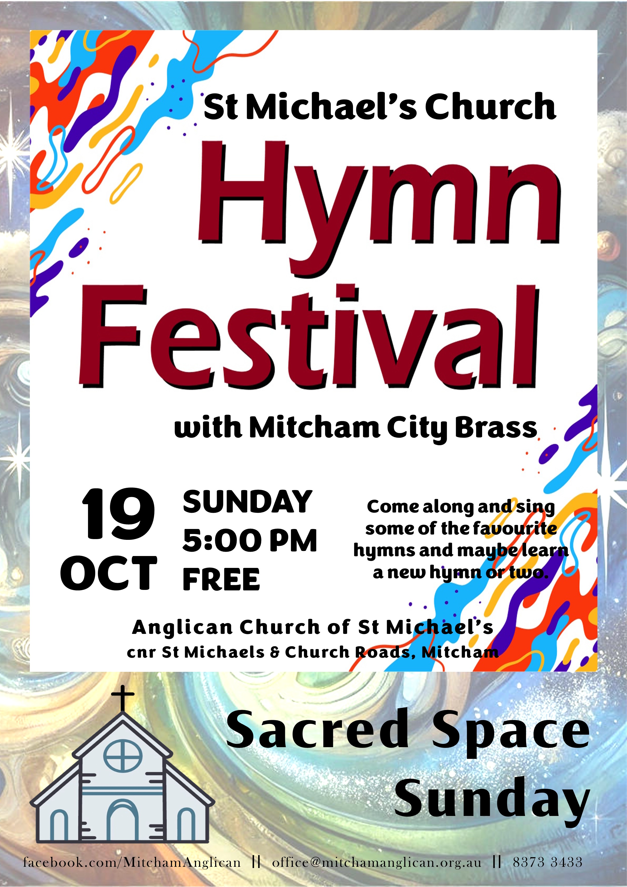 On Sunday 19 October 5:00pm the Sacred Space Program at St Michael’s, Mitcham will be a Hymn Fest – where you can join in singing some of your favourites and maybe learn a new one or two. We also have the great privilege of having Mitcham City Brass joining us to provide the music and lift the roof of the church! Looking forward to having you join us.